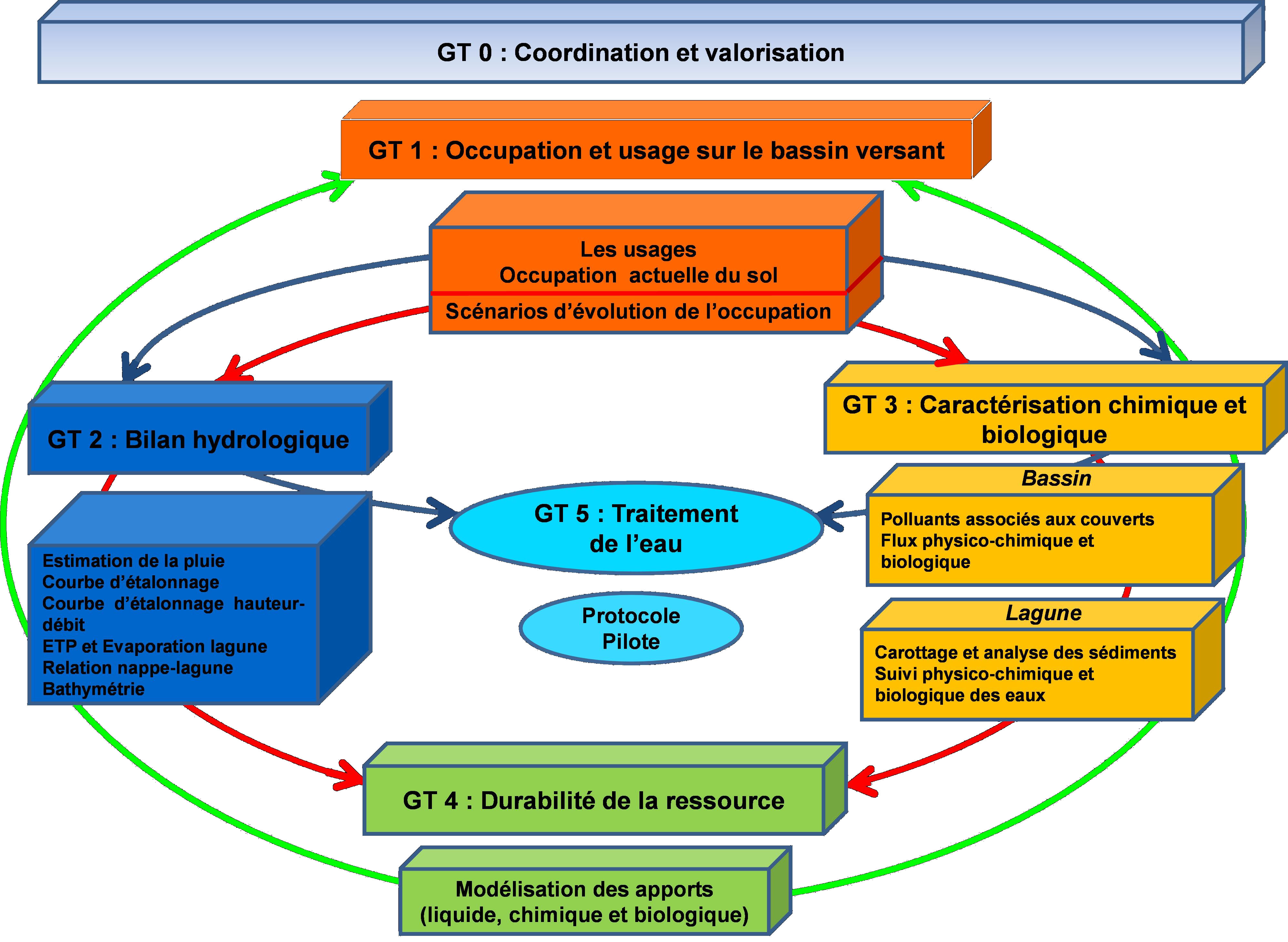 Le projet s'inspire de la grille d'analyse DPSIR (Drivers, Pressures, States, Impacts, Responses) préconisée en particulier par l'Agence Européenne de l'Environnement. Dans cette démarche, les forçages (drivers) sont l'occupation et les usages analysés dans le Groupe de Travail 1 (GT1) associés aux variables du forçage climatique (Précipitation, paramètres climatiques (vent, température, humidité relative) représentés dans l'ETP) du GT2. Les forçages définissent les pressions (les pollutions sur le bassin (GT3) et les apports d'eau au bassin (GT2) qui se traduisent en un état, la qualité de l'eau de la lagune (GT3). Les impacts sur l'écosystème et les populations ne sont pas traités. Par contre, nous proposons des réponses immédiates à l'état de la lagune à travers l'établissement d'un procédé efficient de traitement de l'eau adapté à l'état de la lagune (GT5) et des analyses par modélisation des conséquences de l'évolution de l'occupation du bassin (GT4).